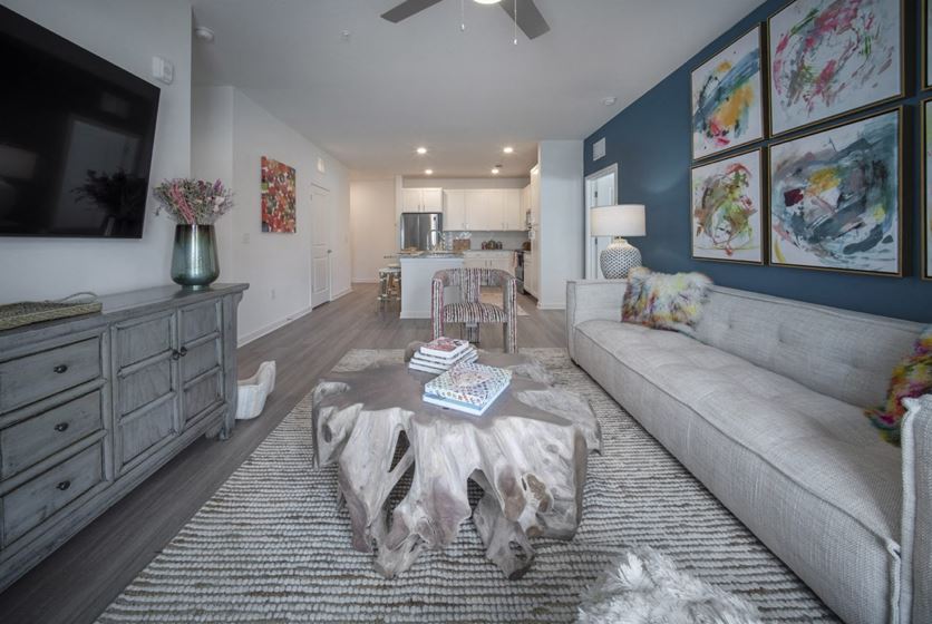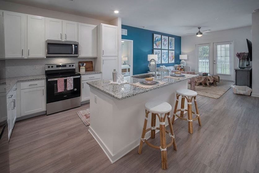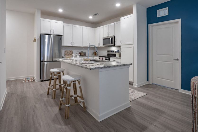 - Spread out and enjoy your sleek and modern apartment home with an open concept floor plan and stunning wood-grain plank flooring throughout the main living area. Gather with friends and family at the spacious kitchen island, this is the perfect spot for relaxing and entertaining company.