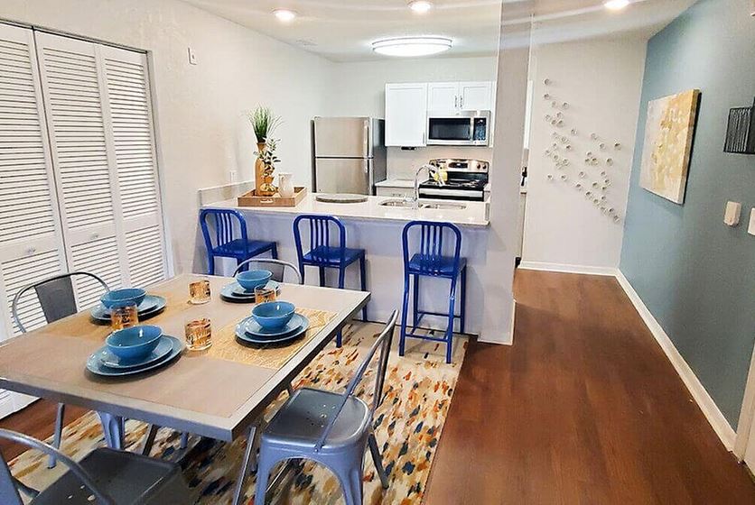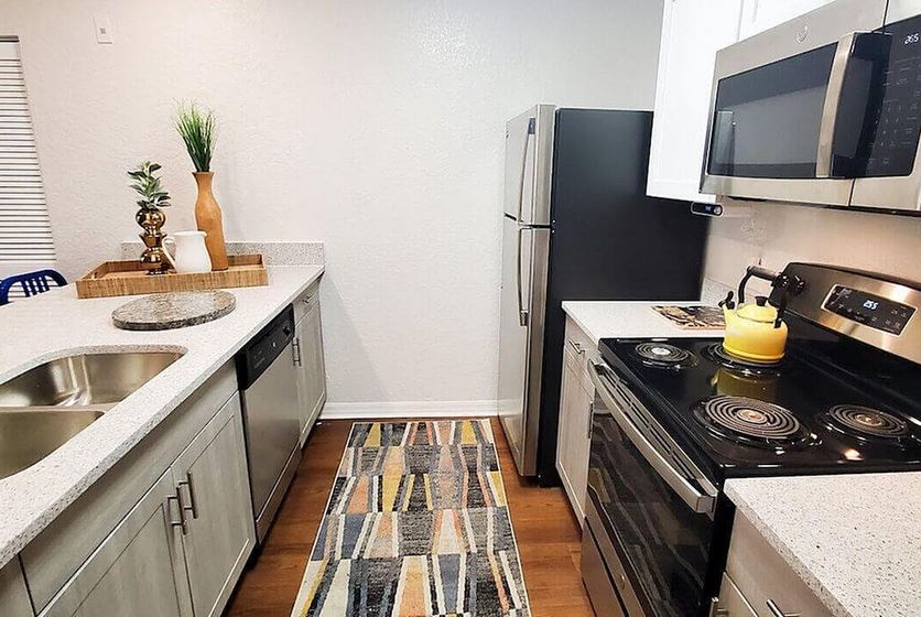 - Ask about upgraded apartments featuring granite countertops, black appliances, wood-style flooring, a 42-inch TV in the living room, and upgraded furniture packages.