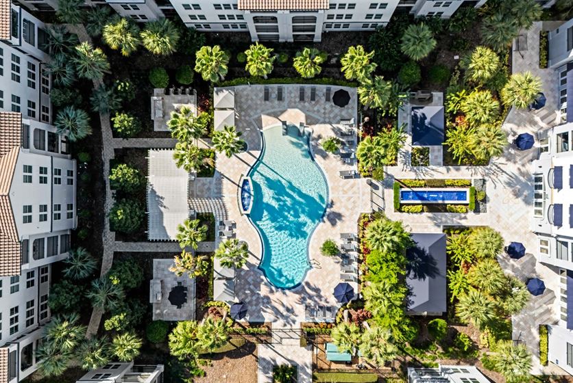 - Resort amenities including beach entry pool, outdoor cabanas, and clubhouse with social area