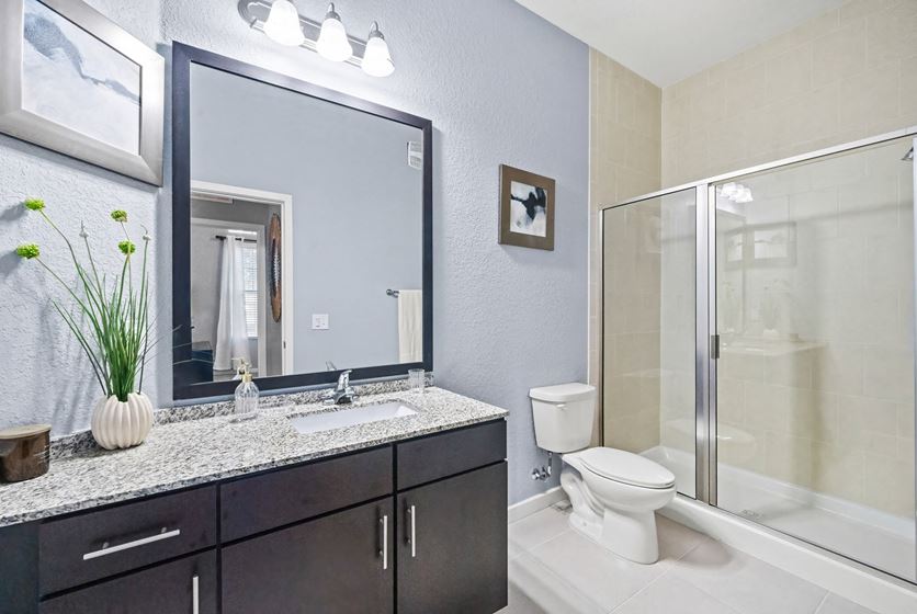 - Bathrooms feature granite countertops, XL framed mirrors, and walk-in showers