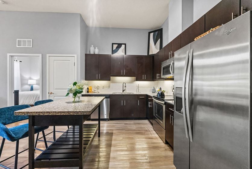 - Chef's kitchens with granite countertops, stainless steel appliances with ice and water on the door, glass stovetops, and movable kitchen islands