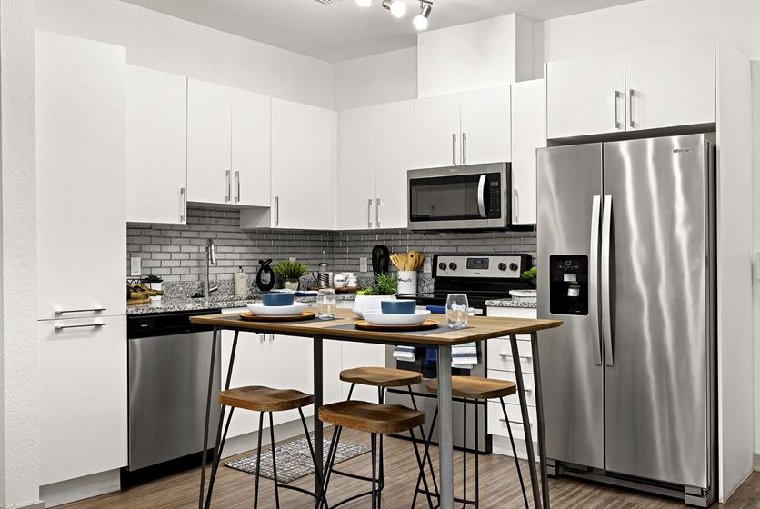 These modern and spacious 1-, 2-, and 3-bedroom apartment homes offer luxurious features like designer kitchen cabinets imported from Italy, natural polished stone counters in the kitchen and baths, side-by-side stainless steel fridges with external water & ice dispensers, and so much more. Enjoy the Florida sun on your screened-in patio or spacious balcony available in select apartment homes.